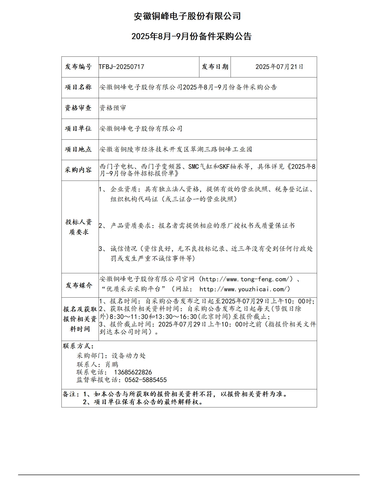 安徽銅峰電子股份有限公司 (備件公告)_01