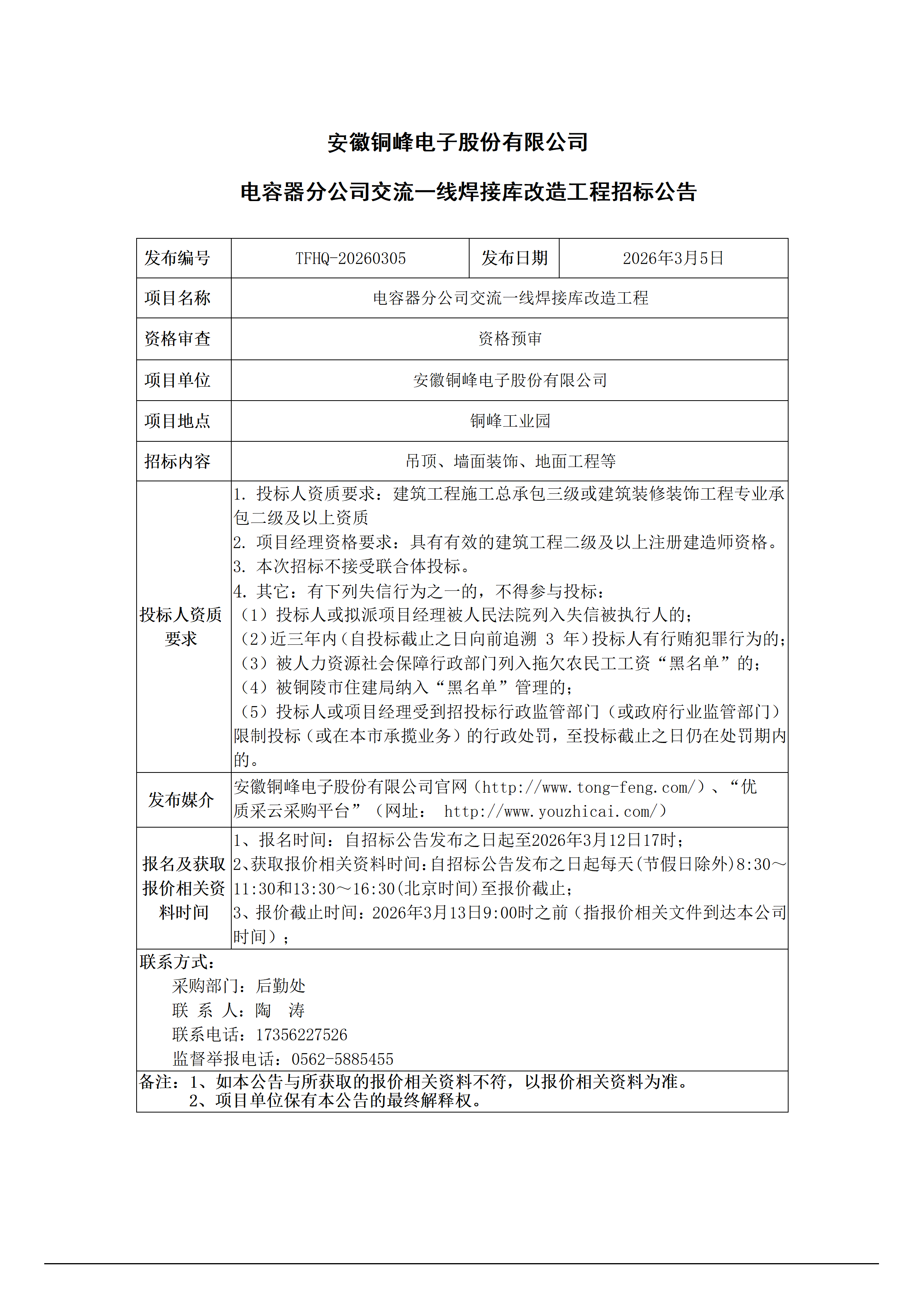 安徽銅峰電子股份有限公司 (電容器分公司交流一線焊接庫(kù)改造工程 招標(biāo)公告)_01