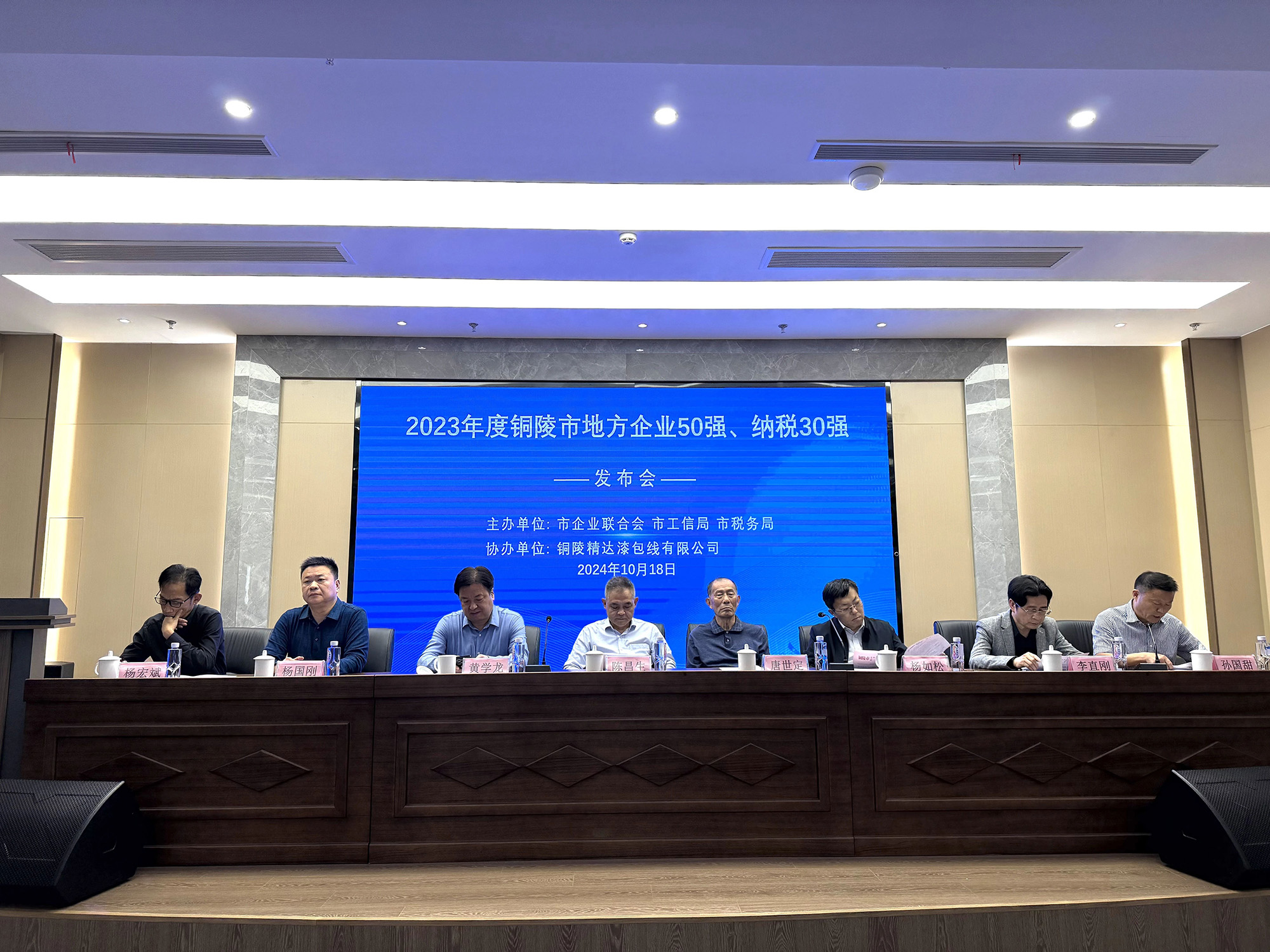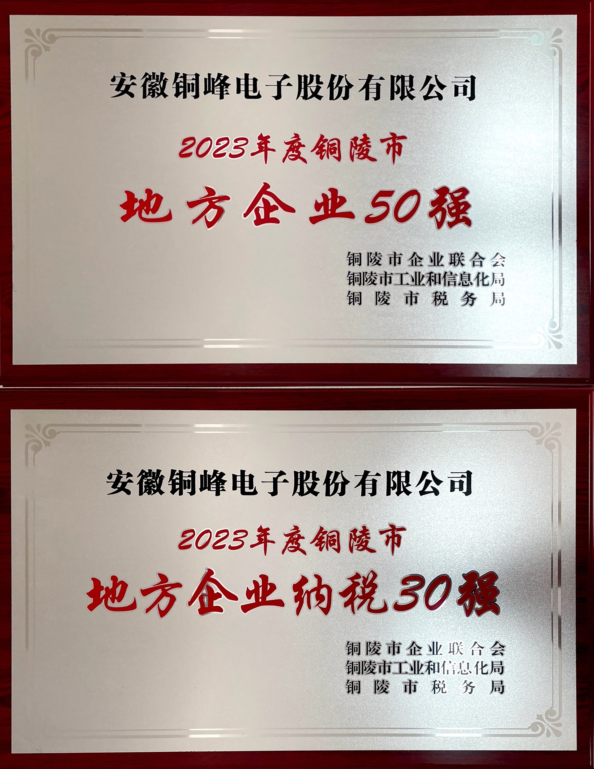 10月18日,由市企業(yè)聯(lián)合會、市工信局、市稅務(wù)局主辦的2023年度銅陵市地方企業(yè)50強(qiáng)、地方企業(yè)納稅30強(qiáng)發(fā)布會舉行,公司再次榮獲“地方企業(yè)50強(qiáng)”“地方企業(yè)納稅30強(qiáng)”兩項榮譽(yù)。公司副總經(jīng)理、財務(wù)總監(jiān)郭傳紅代表公司現(xiàn)場領(lǐng)取榮譽(yù)牌匾。